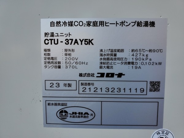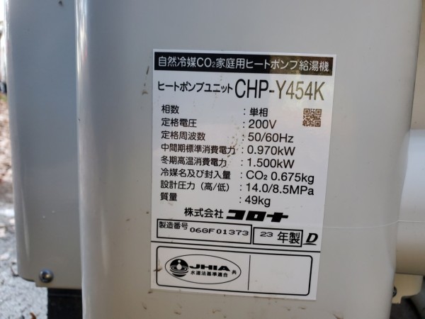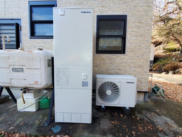 忍野村内野コロナ自然冷媒CO2家庭用ヒートポンプ給湯機ヒートポンプユニットCHP-Y454K、貯湯ユニットCTU-37AY5K エコキュート交換工事
