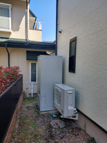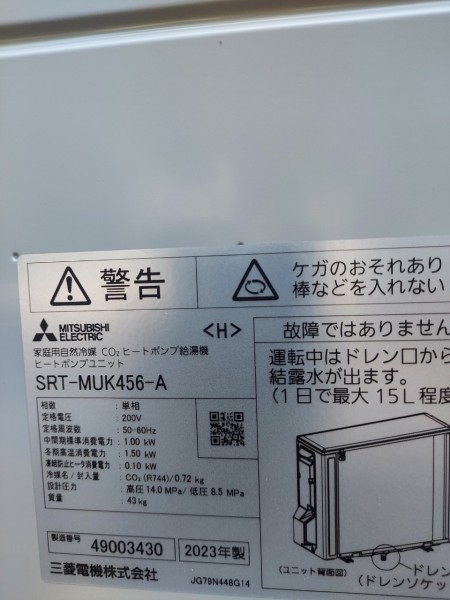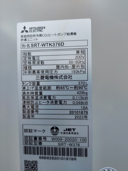 甲府市小曲町 三菱電機自然冷媒CO2家庭用ヒートポンプ給湯機ヒートポンプユニットSRT-MUK456-A、貯湯ユニットSRT-WTK376D エコキュート交換工事