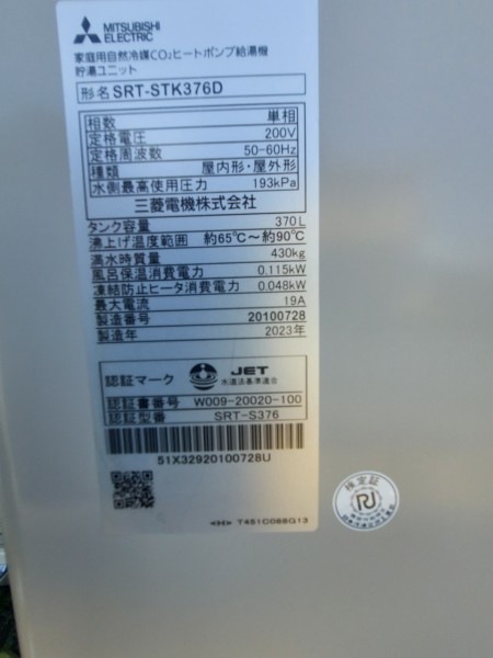 早川町湯島 三菱電機自然冷媒CO2家庭用ヒートポンプ給湯機 貯湯ユニットSRT-STK376D エコキュート交換工事