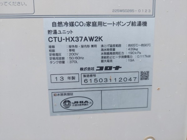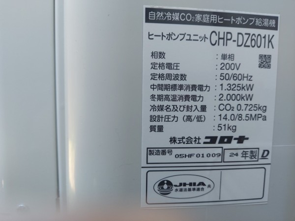 昭和町押越 コロナ自然冷媒CO2家庭用ヒートポンプ給湯機ヒートポンプユニットCHP-DZ601K エコキュート交換工事