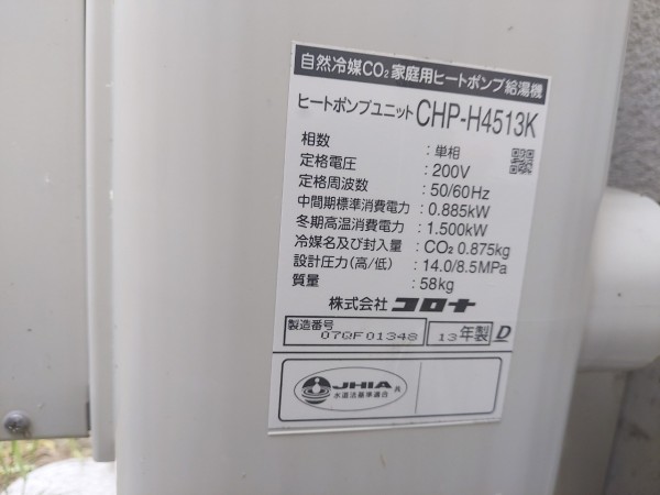 昭和町押越 コロナエコキュート→コロナ自然冷媒CO2家庭用ヒートポンプ給湯機ヒートポンプユニットCHP-DZ601K エコキュート交換工事