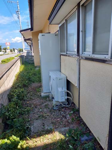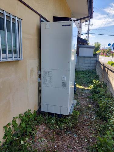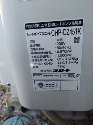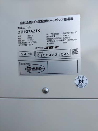 甲府市金竹町 コロナ自然冷媒CO2家庭用ヒートポンプ給湯機ヒートポンプユニットCTU-37AZ1K、ヒートポンプユニットCHP-DZ451K エコキュート交換工事