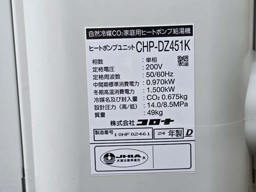 甲斐市万才 コロナ自然冷媒CO2家庭用ヒートポンプ給湯機 ヒートポンプユニットCHP-DZ451K エコキュート交換工事