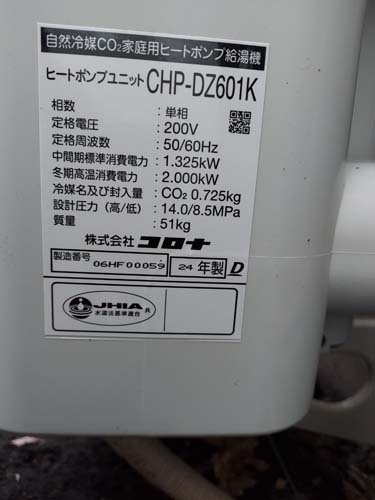 甲斐市天狗沢 コロナ自然冷媒CO2家庭用ヒートポンプ給湯機ヒートポンプユニットCHP-DZ601K エコキュート交換工事|山梨県のエコキュート専門交換工事店|山梨エコキュート交換ショップ補助金対応可能