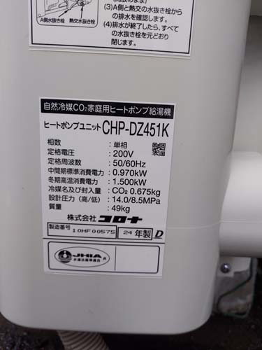 甲州市勝沼町藤井 コロナエコキュート→コロナ自然冷媒CO2家庭用ヒートポンプ給湯機 ヒートポンプユニットCHP-DZ451K エコキュート交換工事