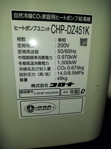 忍野村忍草 コロナ自然冷媒CO2家庭用ヒートポンプ給湯機 ヒートポンプユニットCHP-DZ451K エコキュート交換工事
