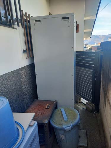 甲州市勝沼町藤井 コロナ自然冷媒CO2家庭用ヒートポンプ給湯機 ヒートポンプユニットCHP-458K→ダイキン工業自然冷媒CO2家庭用ヒートポンプ給湯機貯湯ユニットTU37XFHV、ヒートポンプユニットRQW45XHV エコキュート交換工事
