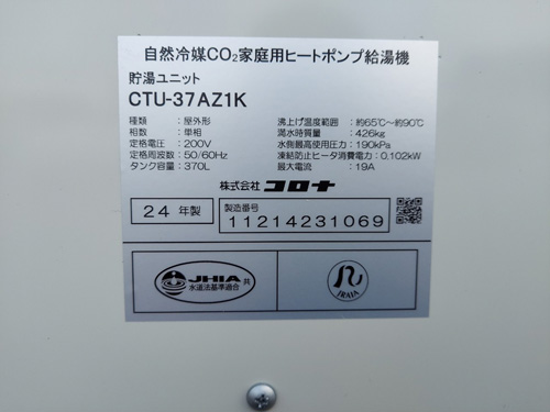 甲斐市上福沢 コロナ自然冷媒CO2家庭用ヒートポンプ給湯機貯湯ユニットCTU-37AZ1K、ヒートポンプユニットCHP-DZ451K エコキュート交換工事