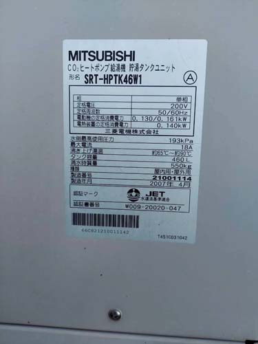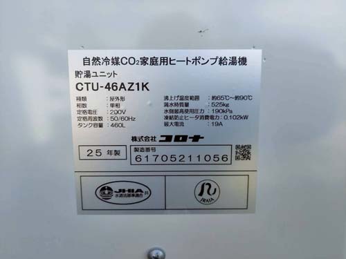 市川三郷町宮原 三菱電機CO2ヒートポンプ給湯機 貯湯タンクユニット SRT-HPTK46W1→コロナ自然冷媒CO2家庭用ヒートポンプ給湯機 ヒートポンプユニットCHP-DZ601K、貯湯ユニットCTU-46AZ1K エコキュート交換工事