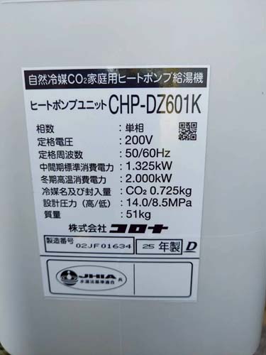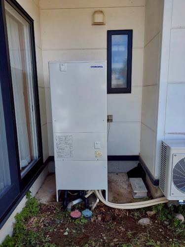 市川三郷町宮原 コロナ自然冷媒CO2家庭用ヒートポンプ給湯機 ヒートポンプユニットCHP-DZ601K、貯湯ユニットCTU-46AZ1K エコキュート交換工事