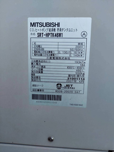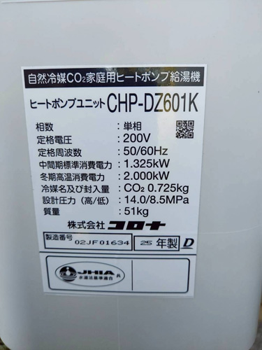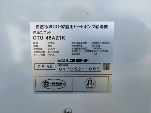 市川三郷町五八 三菱電機CO2ヒートポンプ給湯機貯湯タンクユニットSRT-HPTK46W1→コロナ自然冷媒CO2家庭用ヒートポンプ給湯機ヒートポンプユニットCHP-DZ601K、貯湯ユニットCTU-46AZ1K エコキュート交換工事
