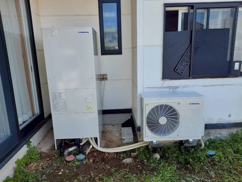 市川三郷町五八 コロナ自然冷媒CO2家庭用ヒートポンプ給湯機ヒートポンプユニットCHP-DZ601K、貯湯ユニットCTU-46AZ1K エコキュート交換工事